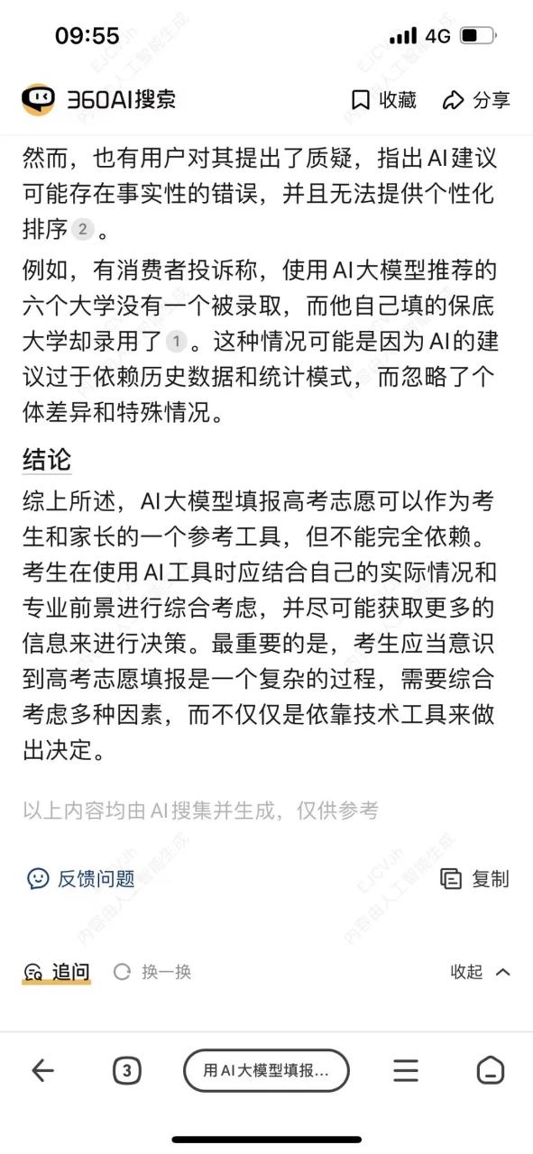 360AI搜索在回答中举例称,曾有消费者投诉,使用AI大模型推荐的六个大学没有一个被录取,而他自己填的保底大学却录用了。这种情况可能就是因为AI的建议过于依赖历史数据和统计模式,而忽略了个体差异和特殊情况。